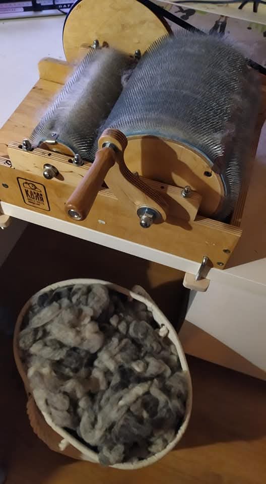Une version plus perfectionnée des cardes à main, actionnée à l’aide d’une manivelle, et qui donne un ruban fil de laine cardée.