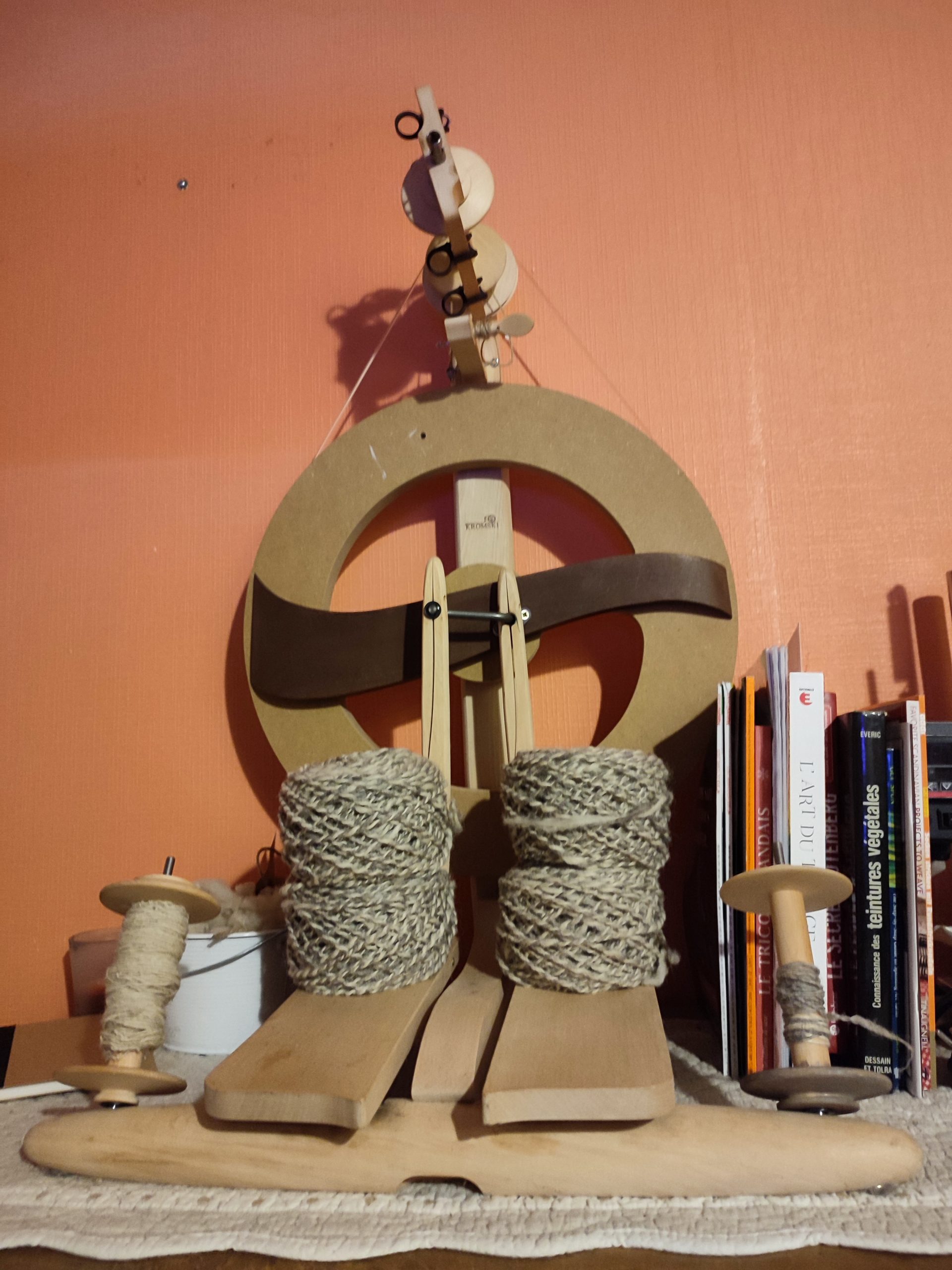 Cette opération peut se faire à la main, à l’aide d’un fuseau ou d’un rouet. A l’atelier, je file avec un rouet. Le voici, c’est le Fantasia de chez Kromski. Sur le plan technique, c’est un rouet simple-entraînement, à tension écossaise (entraîné par l’épinglier).