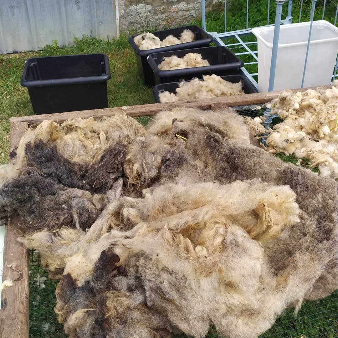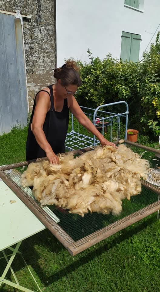 Un tri bien utile ici, les moutons sont principalement dans les marais et leurs toisons ne sont pas d’une propreté impeccable. Pour trier, je commence par étendre une par une, sur un grillage que j’ai encadré – ce qui me sert de table à tri – les toisons des moutons fraîchement tondus. Après en avoir repéré les différentes parties (les épaules, les flancs, les cuisses), il s’agit d’ôter les fibres trop courtes, trop grossières et/ou souillées ainsi que d’éventuels débris végétaux. Ce tri consiste à enlever les mèches les plus sales, les plus courtes, les