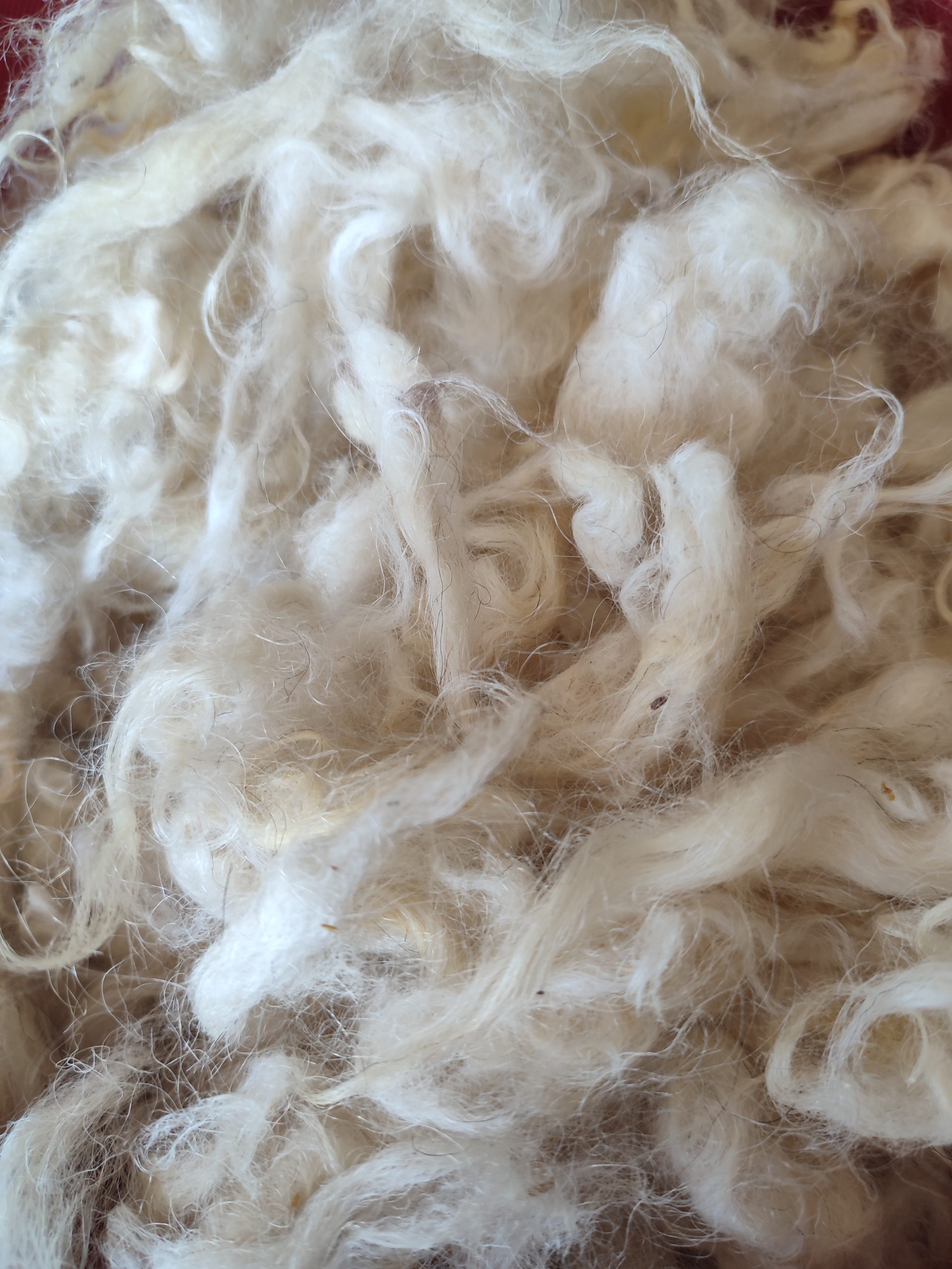 Généralement par temps chaud, c’est plus agréable. Je prépare mes bacs avec l’eau de pluie récoltée les semaines précédentes. Au début j’ai souvent lavé à l’au froide, mais il me restait toujours trop de mèches encore sâles, et grasses. Maintenant je chauffe mon eau de pluie à 60° avec quelques copeaux de savon de marseille et de fiel de boeuf. Je fais tremper mes toisons dans ce premier bain sans remuer pendant 15 minutes, puis j’essore avec une vieille essoreuse de camping, je fais sécher un peu afin que ma laine soit à température extérieure et je rince dans les bacs d’eau froide, là je peux remuer sans problème, je fais deux ou trois rinçages, puis essorage et séchage à l’air libre. un vrai plaisir pour mon chat Darwin qui adore se rouler dedans.